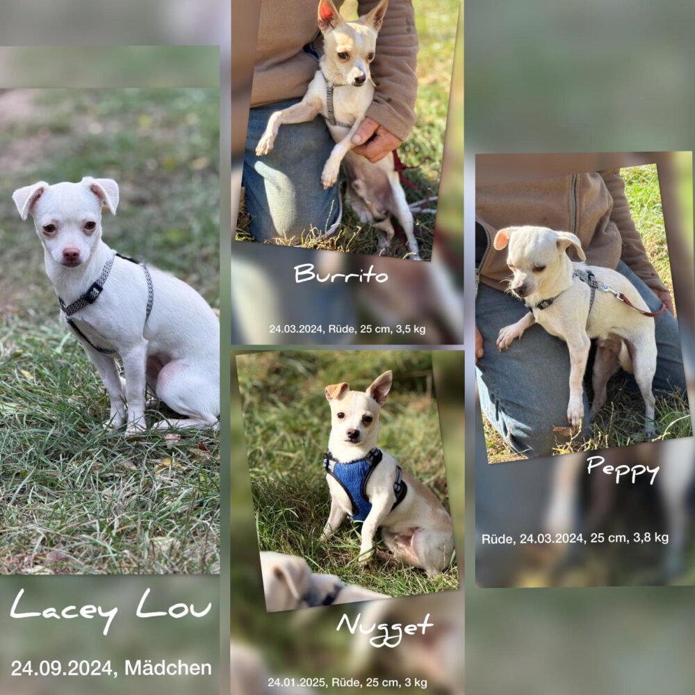 Hier stellen wir euch zunächst Nugget vor. Er ist am 24.01.2025 geboren, 25 cm groß und hat ein Gewicht von 3 kg. Sehr lieb und zugänglich. Verträglich mit seinen Artgenossen, naturlich altersbedingt sehr übermütig, zu jedem Schabernak bereit. Muss das Hundeeinmaleins noch lernen, was nicht verwunderlich ist. Dies gilt im übrigen auch für Lacey Lou, Burrito und Peppy.